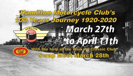 It is organised by the Hamilton Motorcycle Club starts at 730am and is undercover. The combined Hamilton MC Club and the Waikato Classic MC Club will be held on SUNDAY 12th April 2020 7am-230pm Watch for other exciting announcements to comethe Swap Meet will be held in conjunction with the Hamilton MC Clubs 100 year. Finger food provided for riders and helpers and at 25 per head for extras those who have not entered or officiated at the event.